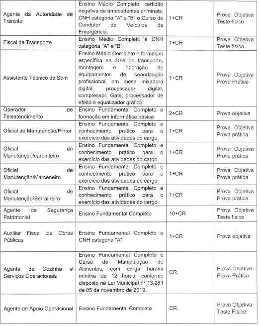 - Teste de Aptidão Física: de caráter eliminatório, válida para os cargos de Agente de Cozinha e Serviços Operacionais, Almoxarife, Agente de Apoio Operacional e Agente de Combate a Endemias.
