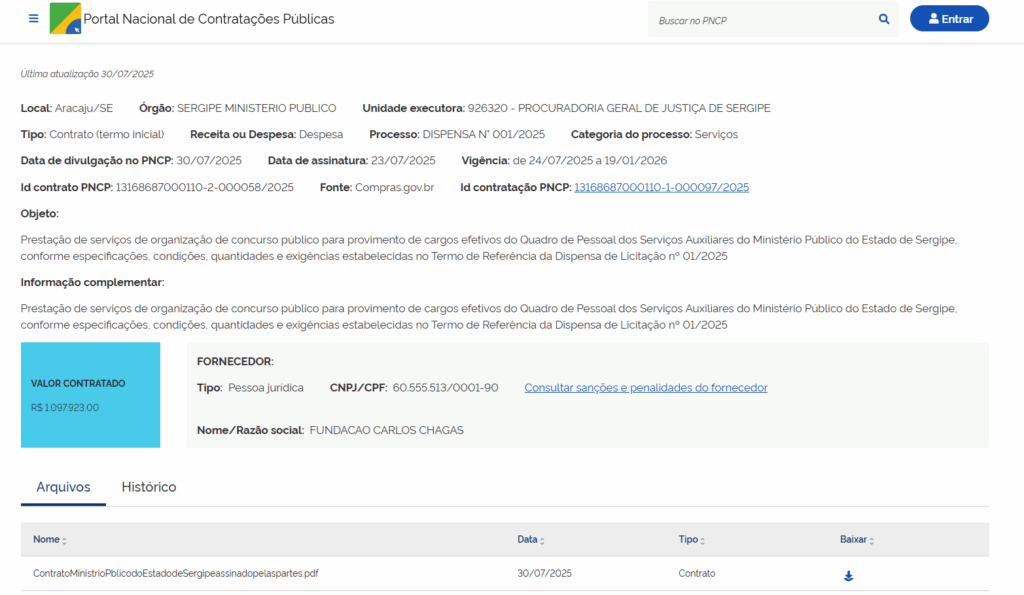 Nova movimentação em relação ao concurso MP SE! O contrato entre o Ministério Público de Sergipe a banca organizadora, a FCC (Fundação Carlos Chagas), foi assinado nesta quarta-feira, 30 de julho. A informação consta no Portal Nacional de Contratações Públicas. Confira na imagem abaixo: