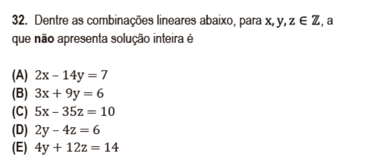 Na opção E, ao dividirmos a equação por 2, teremos uma equação do tipo 2y + 6z = 7. A expressão 2y + 6z é um número par, visto que 2 e 4 são números pares, e, portanto, para valores inteiros de y e z não podem resultar no valor 7.
