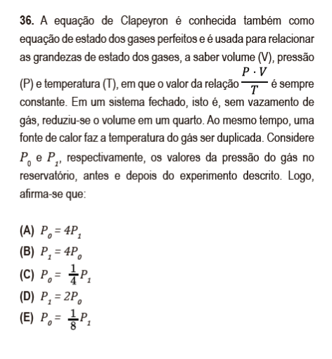 Na sexta linha do texto, é dito “…reduziu-se o volume em um quarto”. Notemos que não dito que reduziu-se o volume PARA um quarto e sim EM um quarto, logo, o novo volume será 3/4 do volume inicial. Como a temperatura foi duplicada, a expressão final ficará igual a P0 = (3/8) P1, que não consta nas opções.