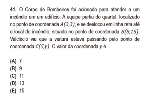 Como 5 é a média aritmética de 2 e 8, concluímos que o ponto (5,y) é o ponto médio de A e de B. Logo, y será a média aritmética de 3 e 15, ou seja, y = (3 + 15)/2 = 9.