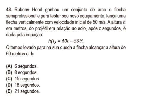 Outra forma de mostrar o erro do enunciado é substituindo 0,4 s na função. Nesse caso, obteremos uma altura máxima de 8 metros. Logo, o projétil NÃO passará pela altura de 60 metros.