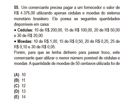 e, reparemos que não utilizamos NENHUMA moeda de R$ 0,50, ou seja, a melhor resposta para a pergunta do problema é ZERO. Tal valor não consta nas opções.