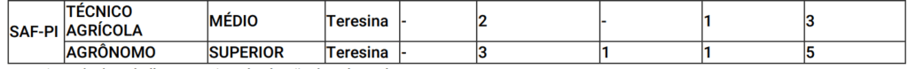 Serão ofertadas 20 vagas para a SAF PI, mas os cargos ainda não foram divulgados. Após a autorização, uma comissão deverá ser definida para iniciar os trabalhos e realizar a seleção no ano de 2026.