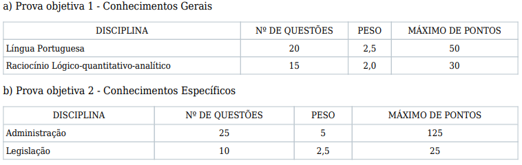 A prova objetiva foi composta por 35 questões de conhecimentos gerais, valendo 80 pontos, e 35 questões de conhecimentos específicos, valendo 150 pontos.
