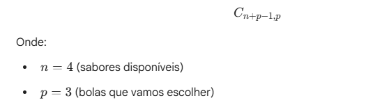 Por que é Combinação com Repetição? A ordem não importa: Um pote com (Chocolate, Chocolate, Limão) é o mesmo que (Limão, Chocolate, Chocolate).