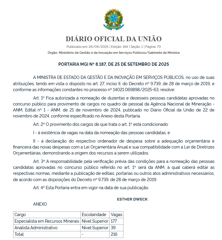 O Ministério da Gestão e Inovação (MGI) autorizou nesta sexta-feira, 26 de setembro, a nomeação de 216 aprovados no concurso público da ANM (Agência Nacional de Mineração)!