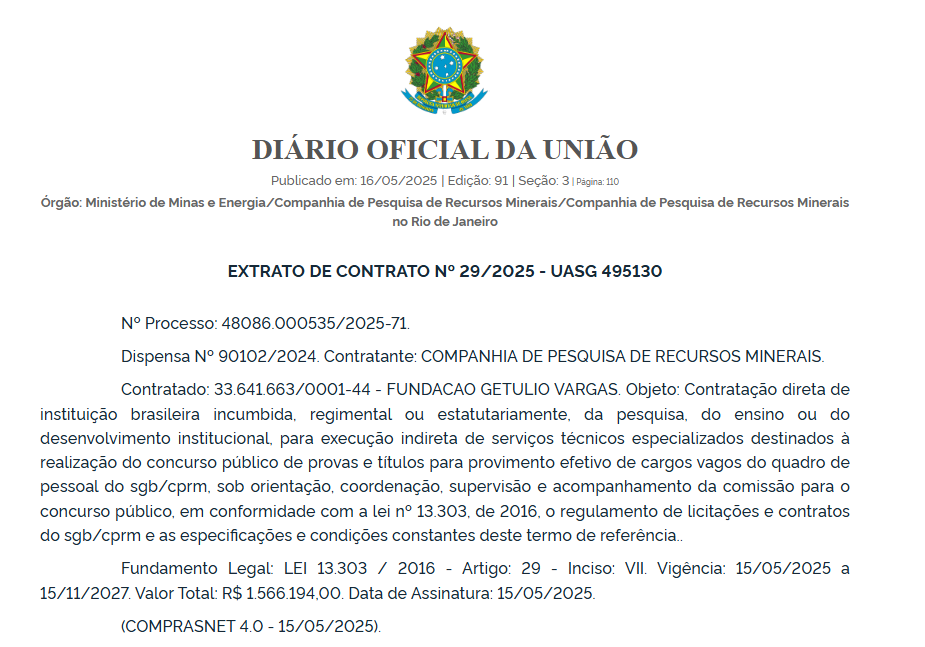 A Companhia de Pesquisa de Recursos Minerais definiu a Fundação Getúlio Vargas (FGC) como banca organizadora do novo concurso CPRM!