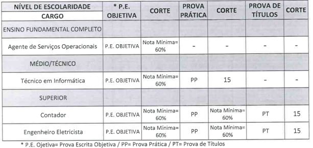 Os candidatos que disputam os cargos de Técnico em Informática, Técnico em Segurança do Trabalho, Agente de Mobilidade e todos os cargos de nível superior e atingirem nota igual ou superior a 60% na prova objetiva serão convocados para uma prova prática.