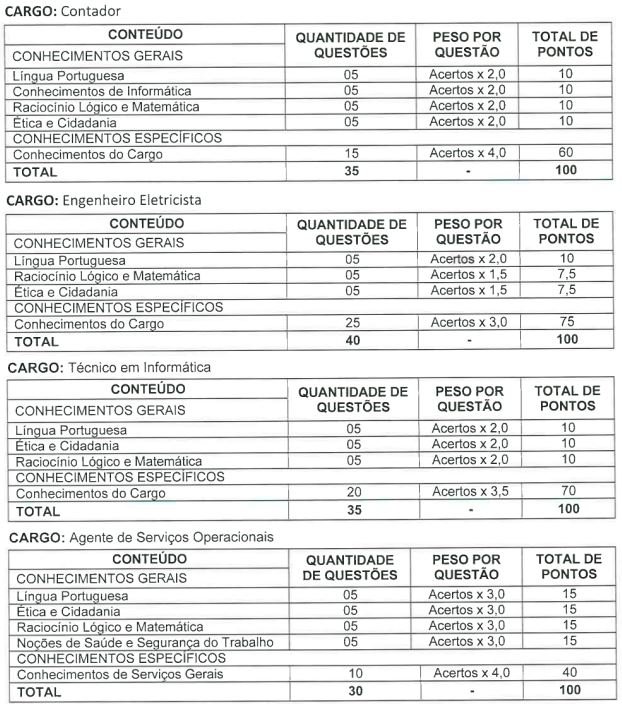 As provas objetivas deverão conter 40 questões para o cargo de Engenheiro Eletricista, 35 questões para os cargos de Contador e de Técnico em Informática, e 30 questões para o cargo de Agente de Serviços Operacionais.
