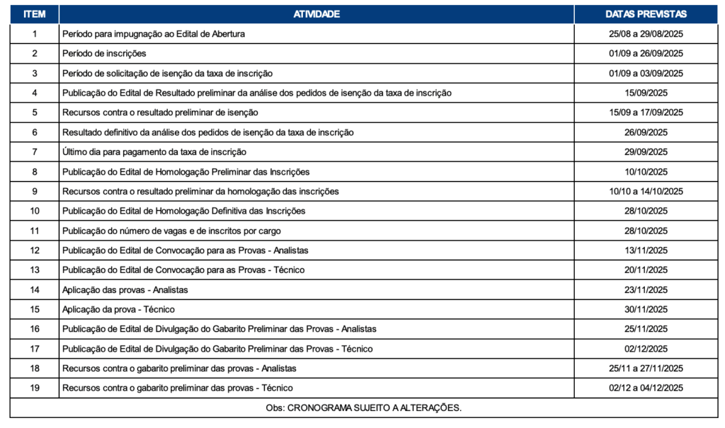 - Prova: 23/11 (Analista) e 30/11/2025 (Técnico)