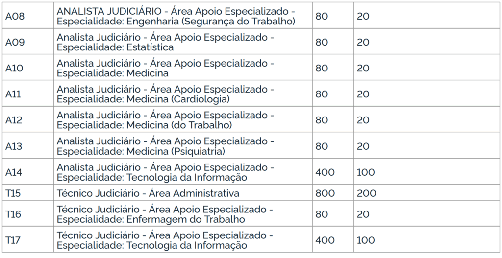 O último edital trouxe vagas de níveis médio e superior. No entanto, após a divulgação do edital foi promulgado o Projeto de Lei 3662/21, que altera a escolaridade do cargo de Técnico Judiciário e estabelece o nível superior como requisito aos concursos Tribunais.