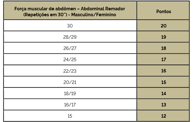 O teste de avaliação física terá caráter eliminatório e classificatório, devendo o candidato alcançar o mínimo de 60% de rendimento em cada modalidade (12 pontos) para aprovação, conforme tabelas a seguir, aplicáveis a todos os candidatos: