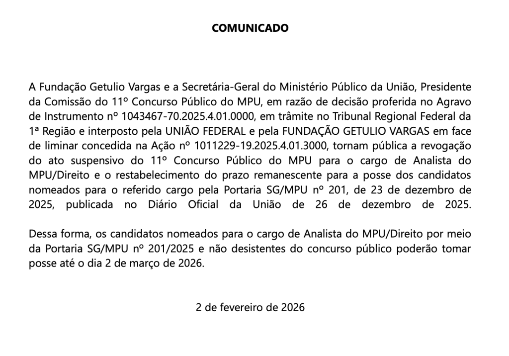 A Fundação Getúlio Vargas divulgou comunicado com a revogação da suspensão do concurso do Ministério Público da União para o cargo de Analista – área de Direito.