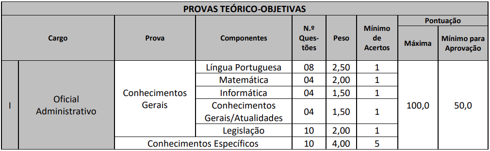 A etapa, de caráter eliminatório e classificatório, será composta por 40 questões do tipo múltipla escolha (4 alternativas). Será aprovado o candidato que obtiver nota mínima de 50% do total de pontos.