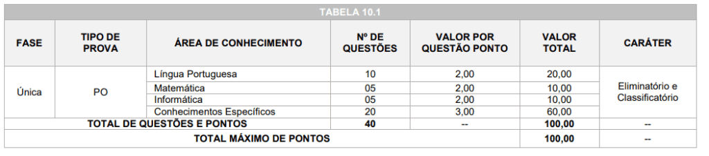 A prova objetiva será composta de 40 (quarenta) questões distribuídas por áreas de conhecimento.