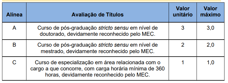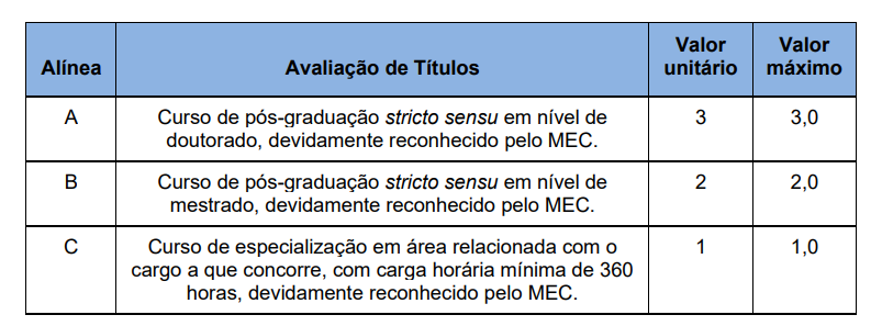 Somente serão convocados para a Prova de Títulos, de caráter exclusivamente classificatório, as pessoas candidatas aprovadas nas Provas Objetivas. Confira a tabela de pontuação: