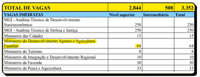 Conforme o que foi divulgado durante coletiva do Ministério da Gestão e Inovação (MGI), o Ministério do Desenvolvimento Agrário e Agricultura Familiar (MDA) ofertará cerca de 64 vagas imediatas para dois cargos: Contador e Engenheiro Agrônomo. Veja: