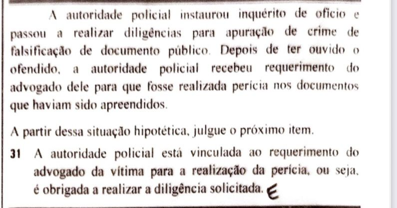 Contudo, no que diz respeito ao pedido para realização da perícia, o acatamento pela Autoridade policial tem desdobramento diferente. Isso porque, o artigo 184 do CPP dispõe especificamente sobre a realização de perícia, esclarecendo que, a solicitação de requerimento para produção de prova de pericial (tanto pelo Ministério Público, ofendido ou indiciado), a autoridade policial poderá negar a perícia, SALVO no caso de exame de corpo de delito, cuja exceção encontra-se exatamente no que aconteceu no enunciado, já que a falsificação era no documento, e o pedido de perícia era no documento, que era o corpo do delito, e nesse caso em específico, ele não pode negar a perícia, estando assim, vinculado.