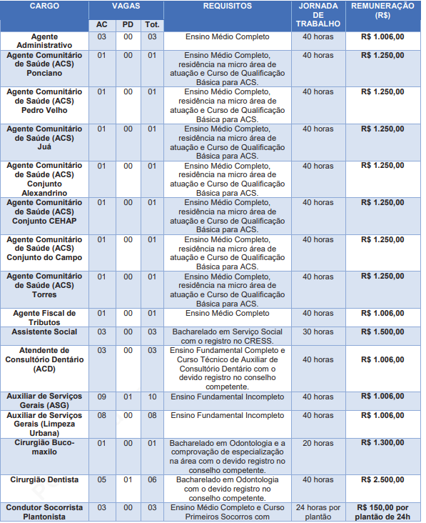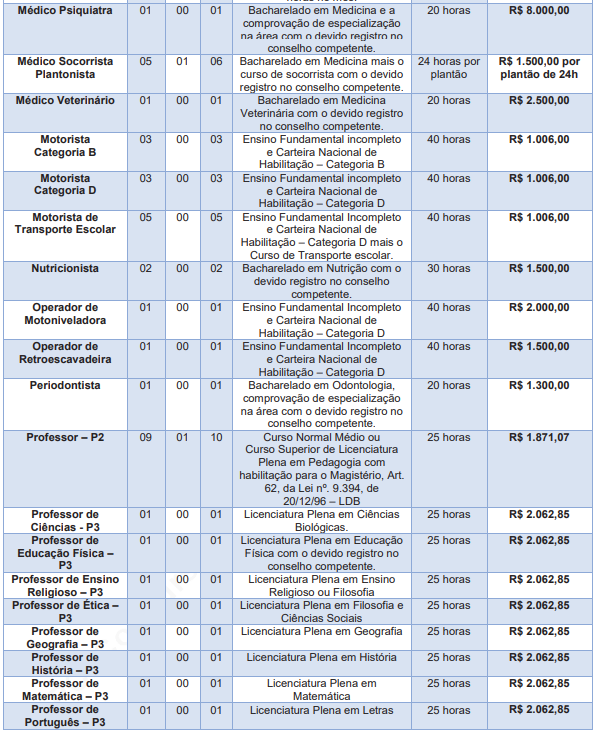 Estão previstas 83 vagas para diversos cargos nas áreas de saúde, educação, infraestrutura, administração e serviços gerais. Destaque para os cargos de professor, técnico de enfermagem, agente comunitário de saúde, fiscal de tributos, assistente administrativo, motorista, gari, pedreiro e guarda municipal.