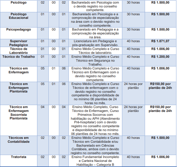 Os salários variam entre R$ 1.412,00 e R$ 2.884,00, a depender da função e da carga horária, que poderá ser de 30 ou 40 horas semanais.