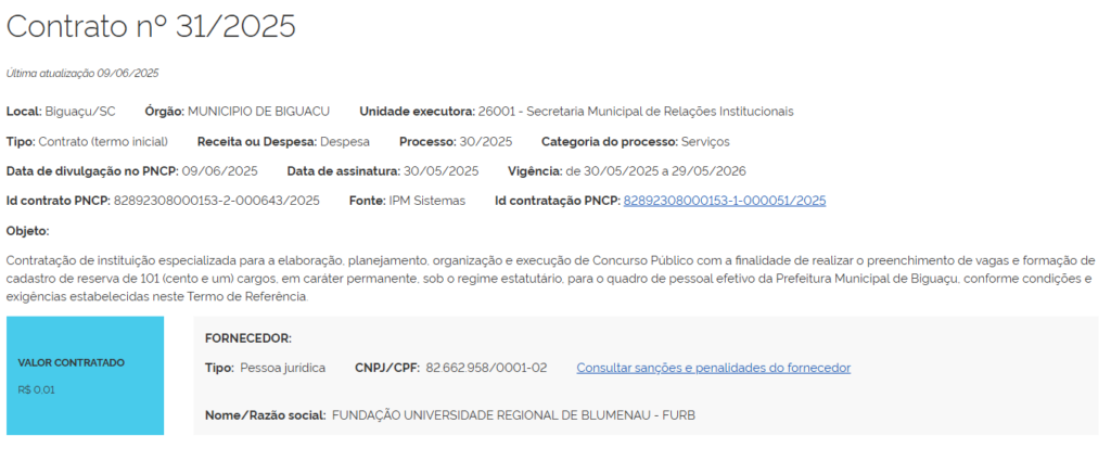 Isso porque a banca organizadora do certame já foi contratada. A FURB será a empresa responsável pela organização do próximo edital.