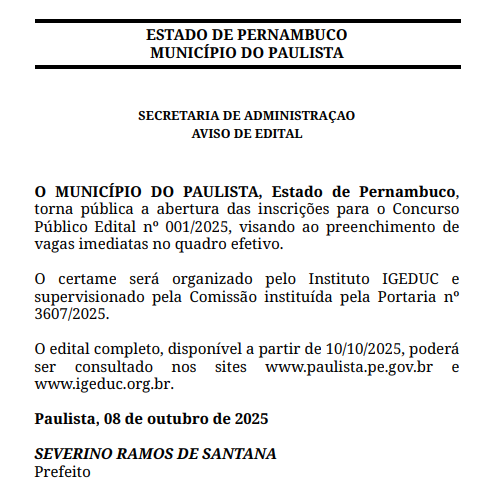 Em breve o edital de concurso público da Prefeitura de Paulista, cidade de Pernambuco, será oficialmente divulgado!