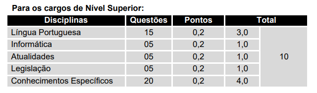A Prova Objetiva de Múltipla Escolha será aplicada a todos os candidatos inscritos com duração máxima de 03h30. Será atribuída nota de 0 a 10 pontos. A avaliação será composta de 50 questões conforme as tabelas: