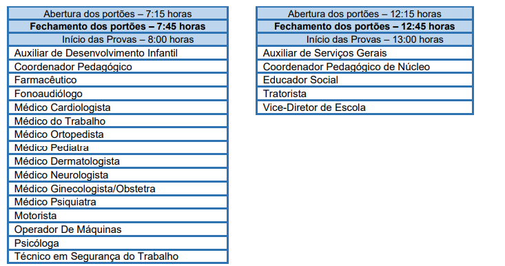 Núcleo e Vice-Diretor de Escola terão a duração de 3h e, para os demais cargos a Prova Objetiva terá a duração de 2h30min.