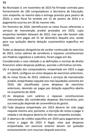 - A letra A está errada, pois se houve aquisição de computadores cujo empenho ocorreu em 2023 e pagamento em 2024, tal pagamento será realizado por meio de “restos a pagar” e não de “despesas de exercícios anteriores”, conforme art. 36 da Lei nº 4.320/64 (“Consideram-se Restos a Pagar as despesas empenhadas mas não pagas até o dia 31 de dezembro distinguindo-se as processadas das não processadas”).