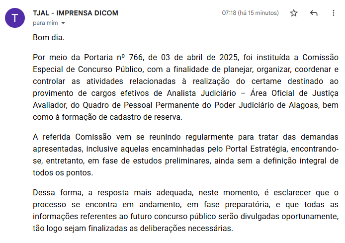 Para saber as novas movimentações referente a elaboração do concurso público a equipe de jornalismo do Estratégia Concursos entrou em contato com o setor de imprensa do TJ AL.
