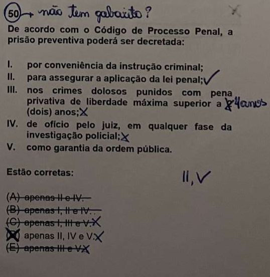 E por fim, a assertiva V – traz a possibilidade da prisão como garantia da ordem pública, o que está correta, cuja previsão está preceituada no caput do art. 312 do CPP.
