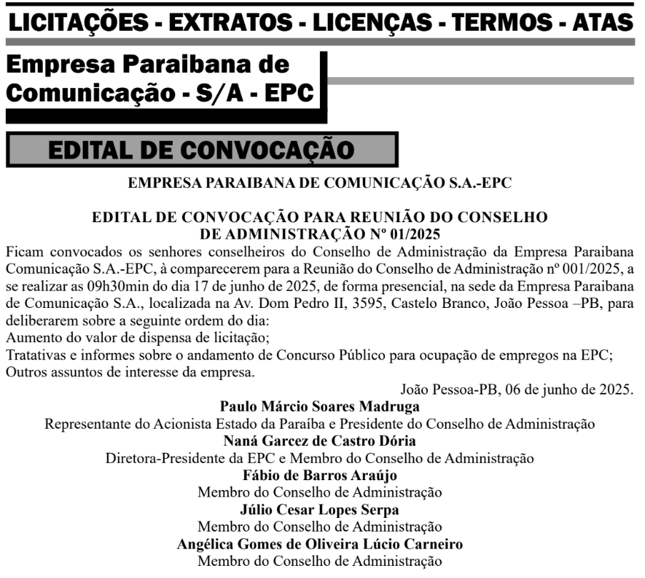 A Reunião do Conselho de Administração no 001/2025 acontecerá de forma presencial, na sede da Empresa Paraibana de Comunicação, localizada na Av. Dom Pedro II, 3595, Castelo Branco, João Pessoa –PB.