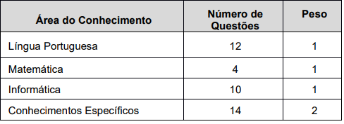Cada questão apresentará 4 (quatro) opções de respostas, sendo apenas uma a correta. Será considerado habilitado o candidato que obtiver, no mínimo, 50% do total de pontos.
