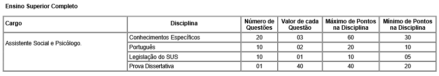 - Assistente Social: Ensino Superior Completo com formação em Serviço Social e registro junto ao Conselho respectivo