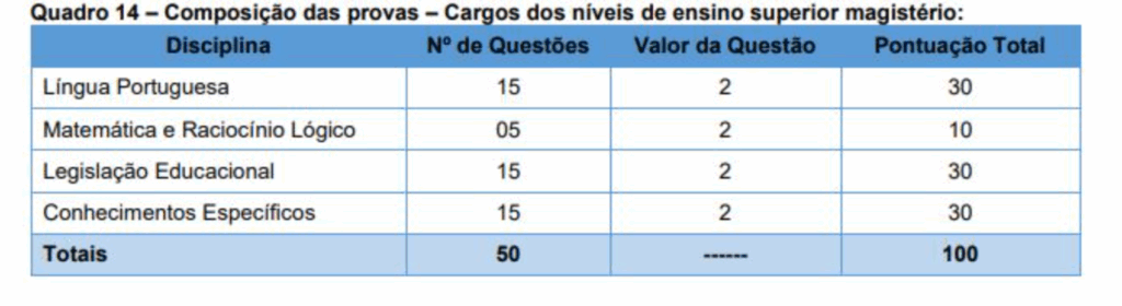 | Professor de Língua Portuguesa | 01 + CR | R$ 5.781,57 | Licenciatura Plena em Letras com habilitação em Língua Portuguesa ou Licenciatura Plena específica em Língua Portuguesa |