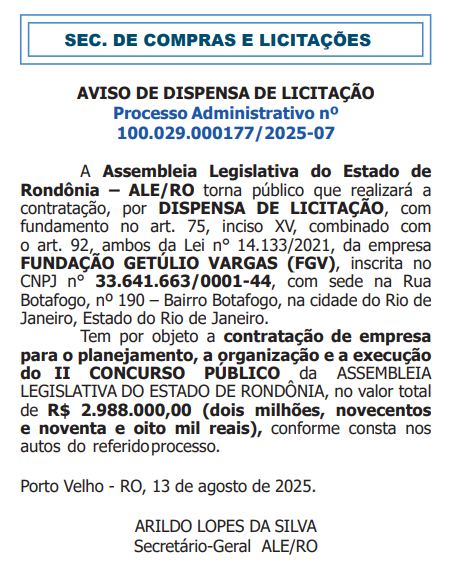 A Assembleia Legislativa do Estado de Rondônia (ALE RO) anunciou a contratação da Fundação Getúlio Vargas (FGV) para o planejamento, organização e execução do II Concurso Público da Casa. Veja a publicação que saiu no Diário Oficial Eletrônico: