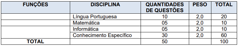 A etapa, de caráter eliminatório e classificatório, será avaliada na escala de 0 a 100 pontos e composta por 50 questões (4 alternativas).
