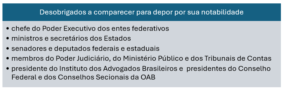 Algumas pessoas são dispensadas do comparecimento para depor, seja por sua notabilidade, seja por questões humanitárias.