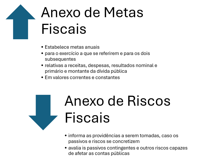 Devemos anotar ainda que o projeto de LDO conterá um Anexo de Metas Fiscais. Esse anexo tem por finalidade estabelecer metas anuais, em valores correntes e constantes, relativas a receitas, despesas, resultados nominal e primário e montante da dívida pública, para o exercício a que se referirem e para os dois seguintes.