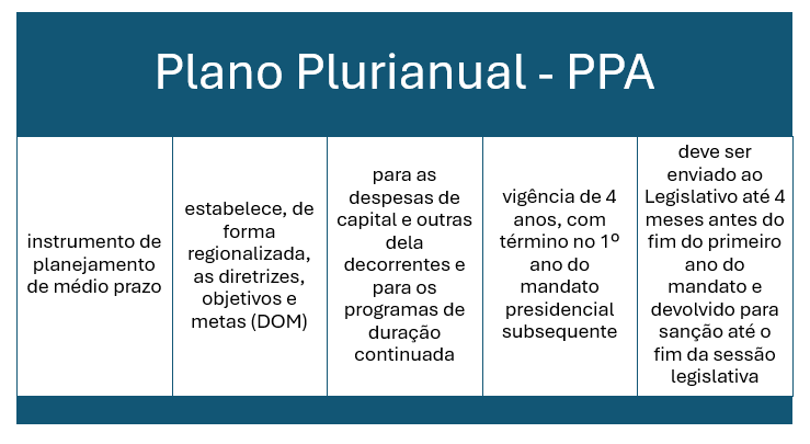 O PPA é um instrumento de planejamento orçamentário de médio prazo, cuja finalidade é estabelecer, de forma regionalizada, as diretrizes, objetivos e metas (DOM) da administração pública federal para as despesas de capital e outras delas decorrentes e para as relativas aos programas de duração continuada.