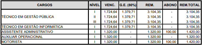 | Técnico em Gestão Pública | 15 | Nível superior | R$ 2.809,37 |