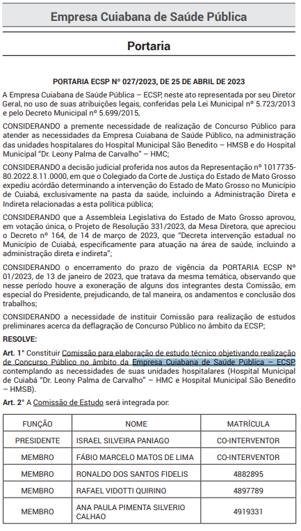Um novo concurso Empresa Cuiabana de Saúde Pública (ECSP) está cada vez mais próximo de ocorrer, já que uma comissão foi instalada para, em até 180 dias, finalizar o estudo técnico de necessidades da entidade.