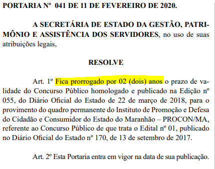 O concurso público do PROCON MA, realizado em 2017, foi prorrogado por mais dois anos, ficando válido até 19 de fevereiro de 2022.
