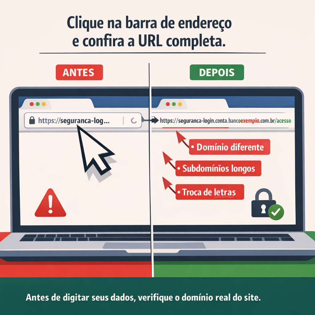 - Ao ser direcionado para uma página, clique no endereço da página de forma a conferir o endereço completo. Por vezes, as páginas maliciosas reproduzem, de maneira idêntica, apenas o início do endereço. Vejamos um exemplo: