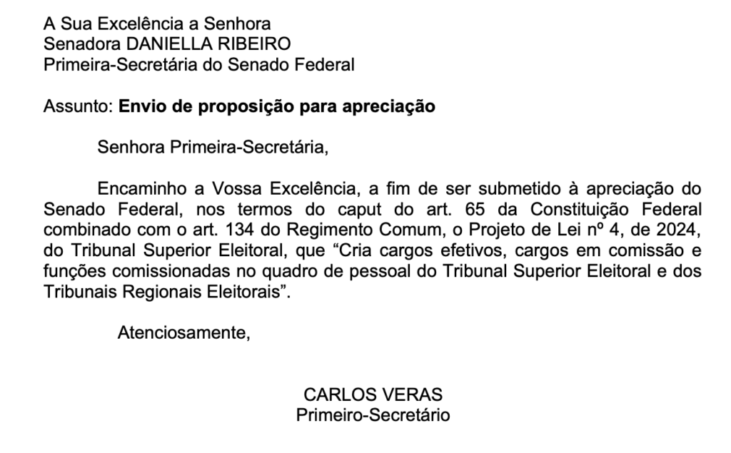 O Projeto de Lei 4/2024, que cria cargos para a Justiça Eleitoral (TSE e TRE’s) teve o texto enviado ao Senado para análise nesta terça-feira, 16 de dezembro.