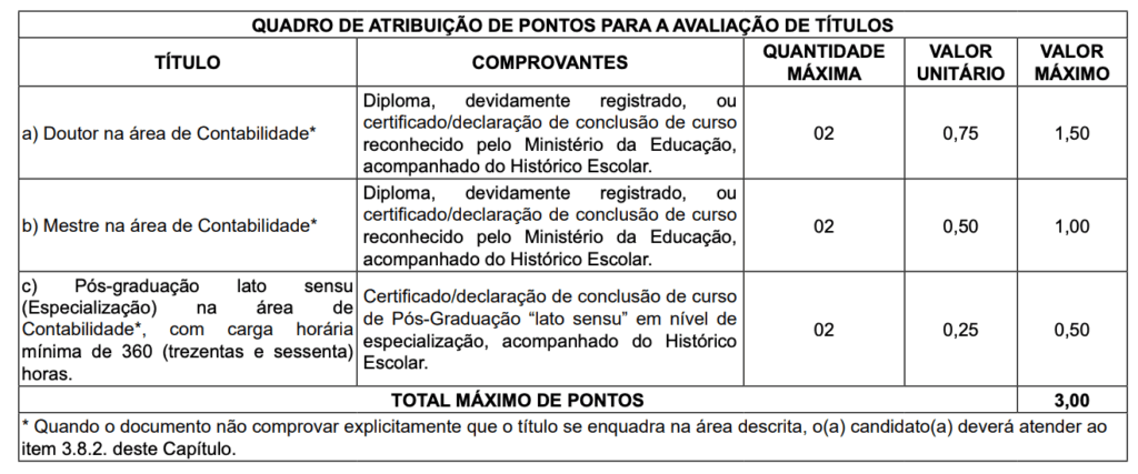 A pontuação dos títulos estará limitada aos valores constantes na tabela de títulos, observando-se os comprovantes, os valores unitário e máximo e a quantidade máxima de cada título.