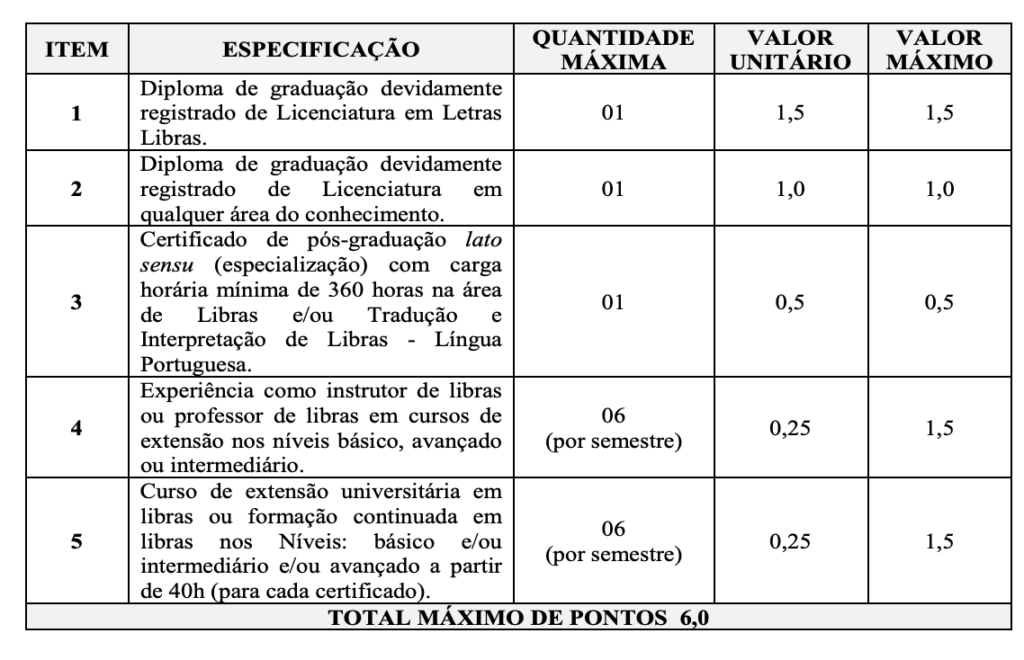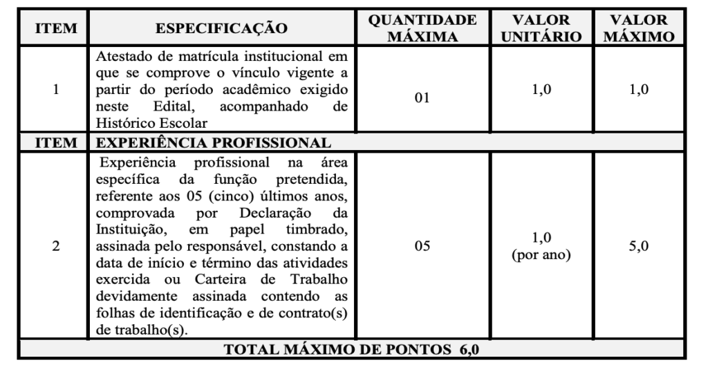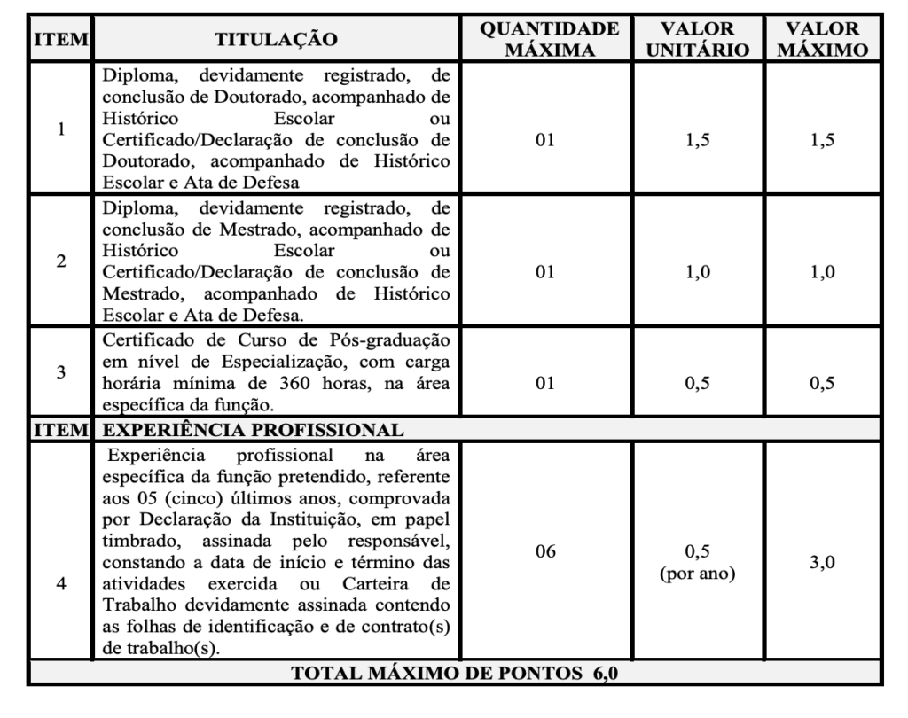 TABELA DE PONTUAÇÃO PARA A AVALIAÇÃO DE TÍTULOS PARA NÍVEL SUPERIOR: