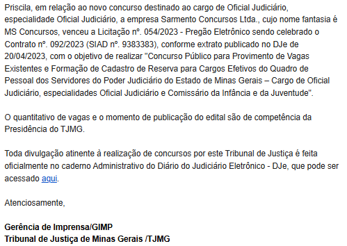 O retorno foi que o “quantitativo de vagas e o momento de publicação do edital são de competência da Presidência do TJMG”, veja: