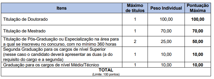 - Prova de títulos, de caráter classificatório, para cargos de níveis médio, técnico e superior;